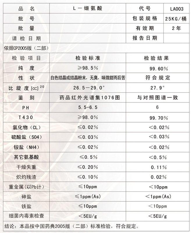 本品為白色結(jié)晶或結(jié)晶性粉末;用乙醇水溶液重結(jié)晶者為無色板狀或磷片狀結(jié)晶。無臭,有特殊苦味。熔點(diǎn)約315度。5%水溶液的PH值為5.5-6.5.對(duì)熱、光及空氣穩(wěn)定。易溶于水(8.85g/100ml,25度),幾乎不溶于乙醇和乙醚.與亮氨酸的分離困難。比旋度為+26.5°至+29.0°